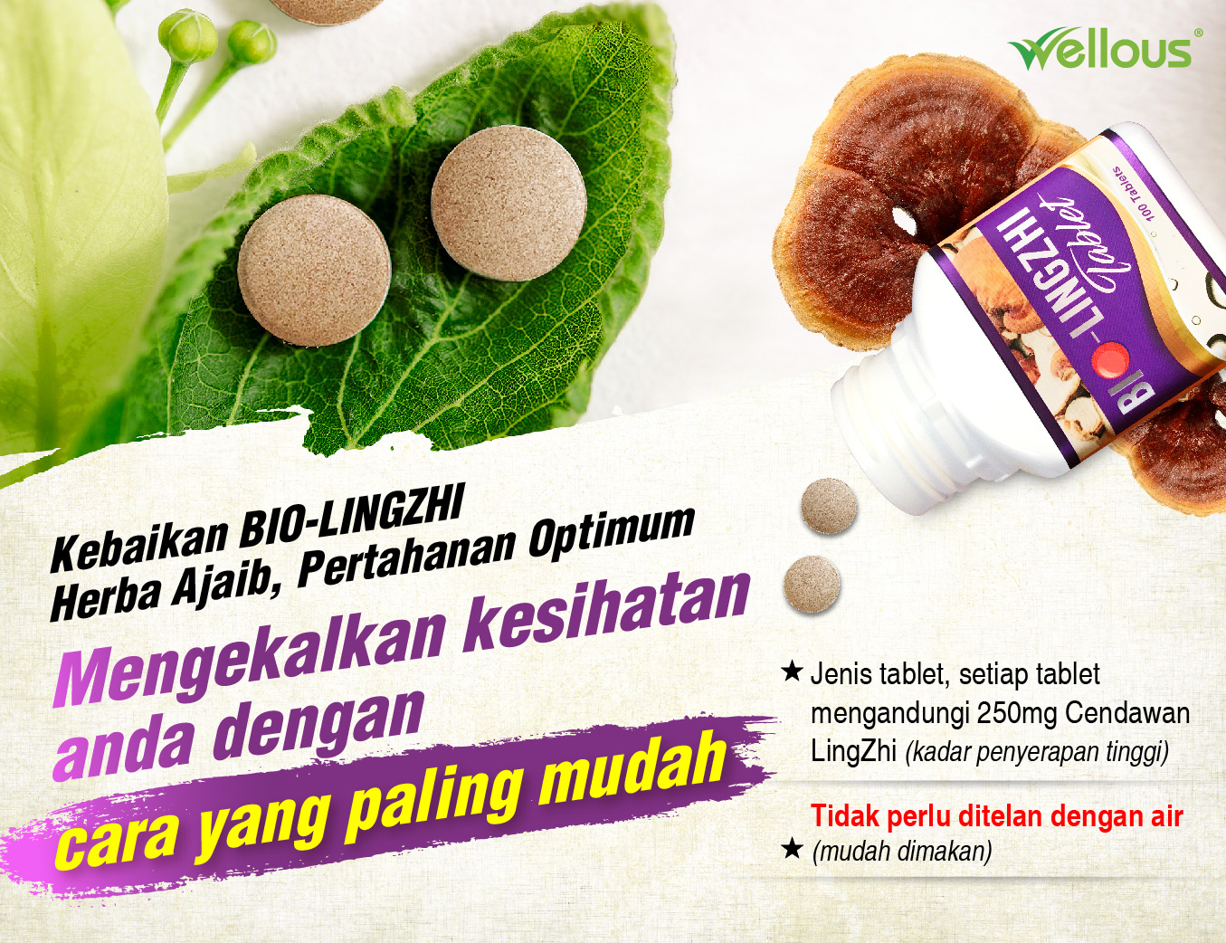 setiap tablet mengandungi 250mg cendawan LingZhi