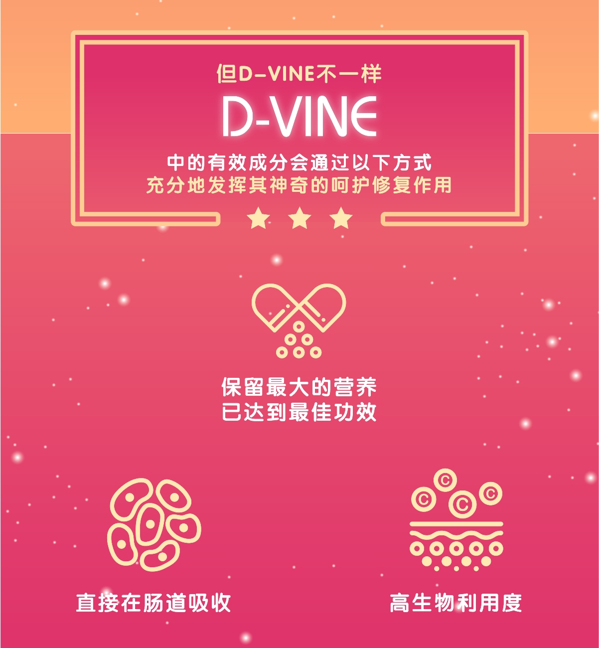 D-VINE 是方便服用的咀嚼型胶原蛋白补充剂。 它的主要成分是胶原蛋白三肽 CTP, VIQUA® 红石榴提取物 以及 Hytolive® 橄榄多酚。 CTP可以被肠道直接吸取, 因此可以更好更快地提供胶原蛋白补充。 D-VINE 中的石榴和橄榄多酚是强大的抗氧化剂, 可以有效地保护和改善皮肤状态。