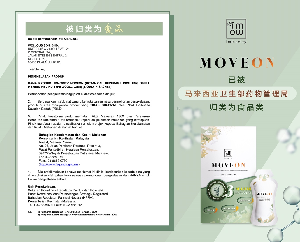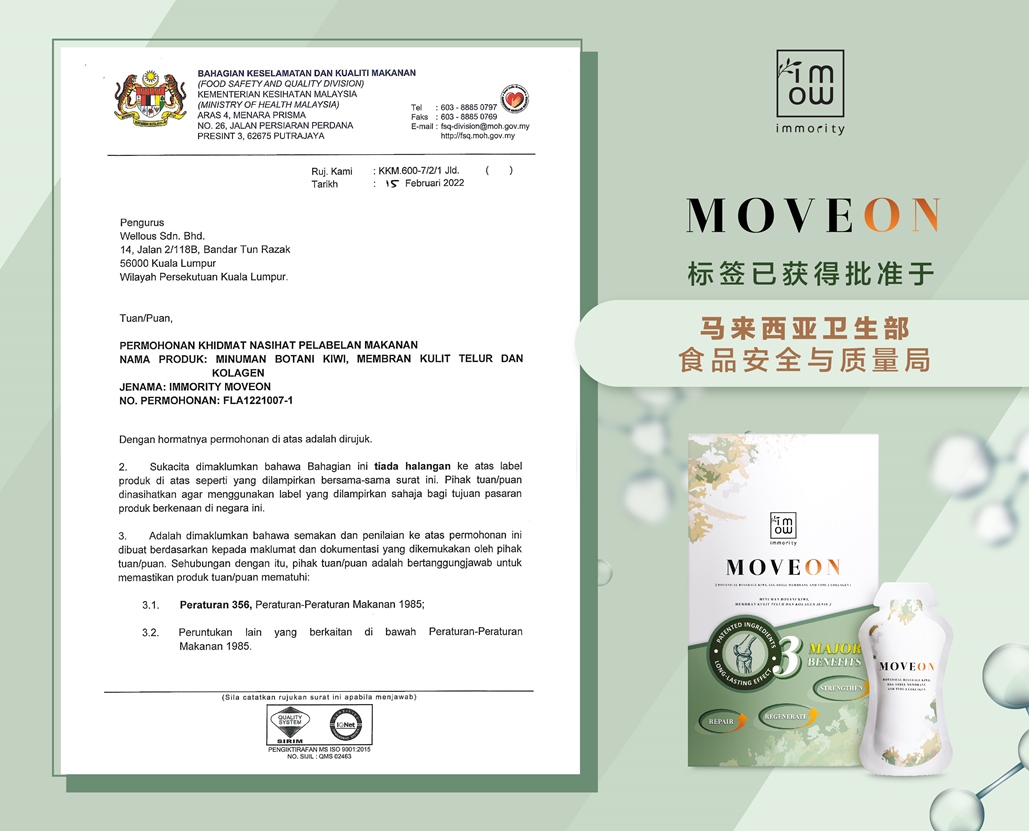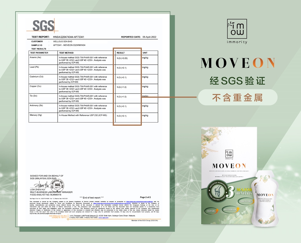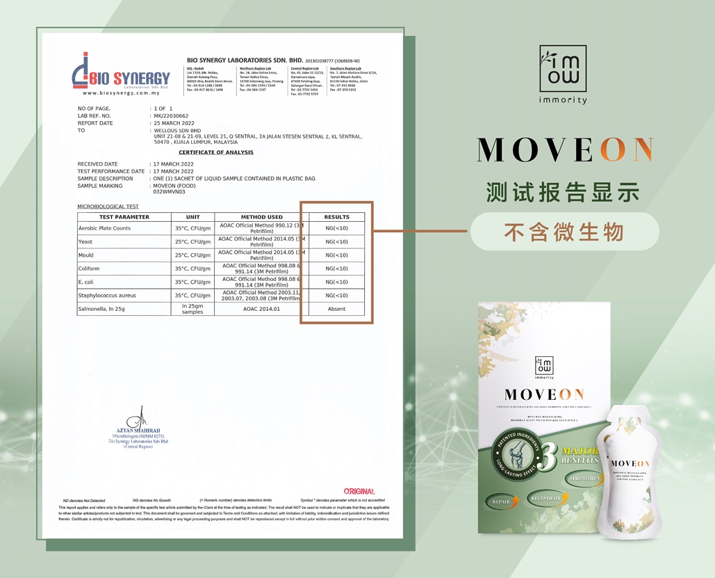 MOVEON是可增强关节和促进骨骼健康的11合1的关节灵活保健饮。MOVEON可帮助修复、再生和强化软骨、肌腱和韧带健康以及增加骨骼密度。其中由主要3 种专利成分配制而成,包括Ovomet® 蛋壳膜、UCII™ 非变性 2 型胶原蛋白,BonePep™ 水解蛋黄肽,能保护关节健康(包括肌肉、骨骼、韧带、肌腱、软骨和滑液)。