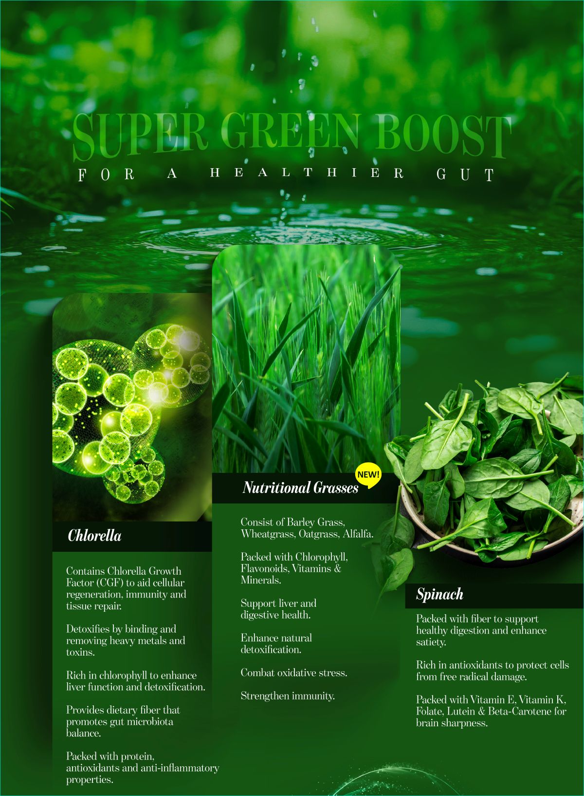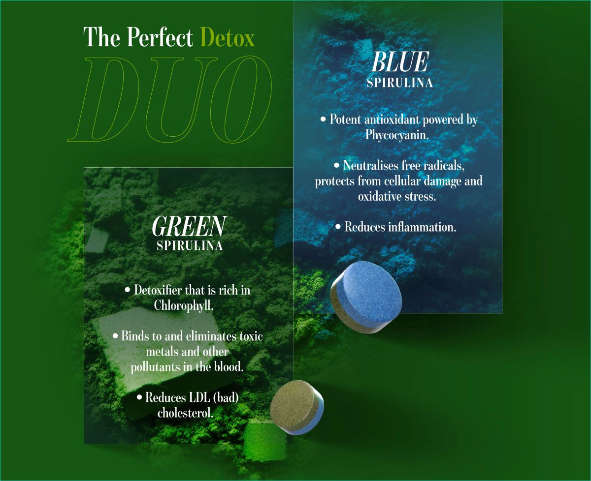 Alga hijau dikenali sebagai “agen detoks semula jadi”, kaya dengan klorofil, protein, serat, mineral. Klorofil membantu ikat logam berat, racun perosak, bahan pencemar, menyahtoksin melalui hati dan usus, membersihkan darah, kurangkan “beban toksin” badan.