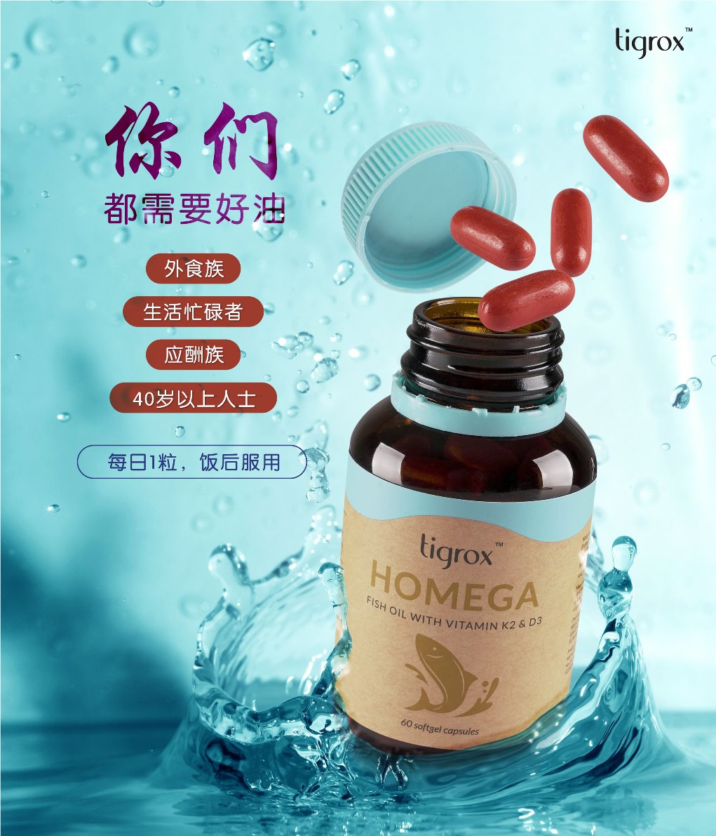 HOMEGA 鱼油软胶囊是全马首个结合维生素 K2 和 D3 的鱼油产品。它采用无污染的深海小型鱼类为萃取原料,并与维生素 K2 和 D3 通过协和作用来维持更良好的血液循环。Homega 适用于外食族,生活忙碌者,应酬族,以及40岁以上人士。