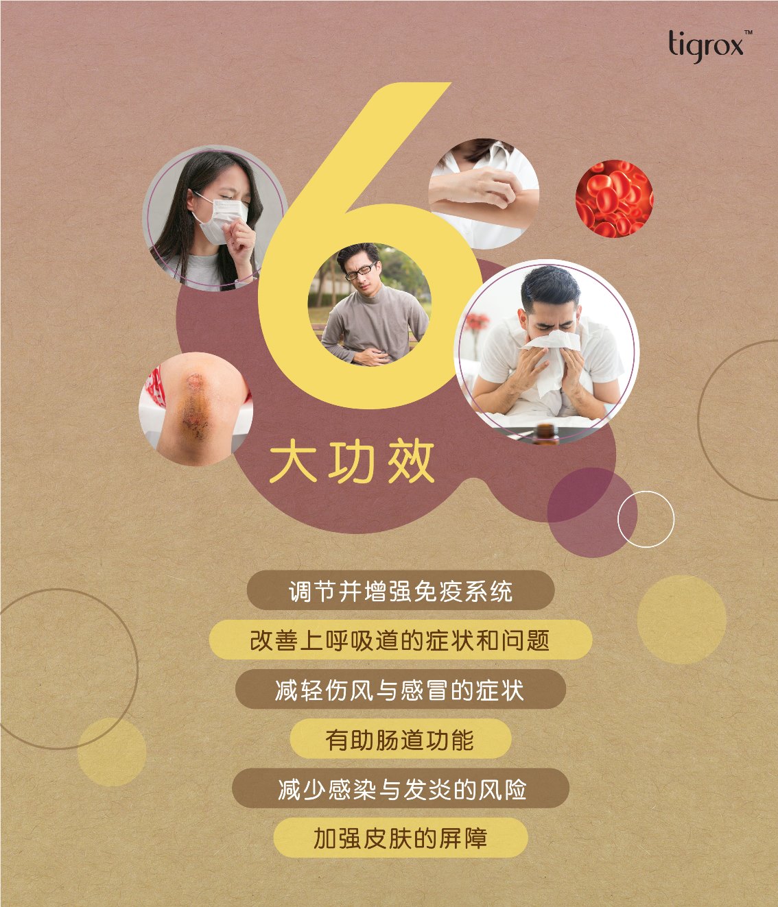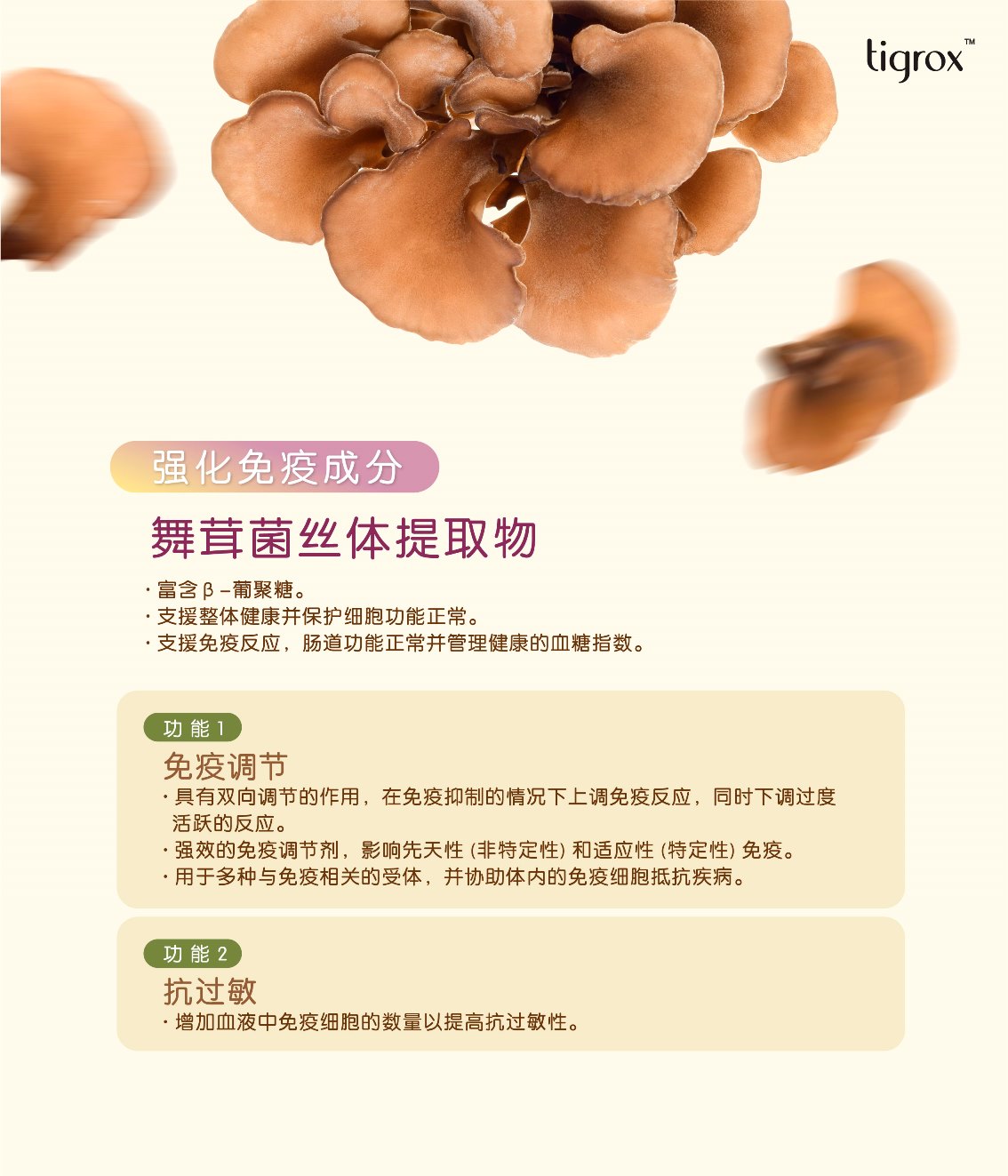 维生素能增强免疫系统功能,并能预防病毒感染。 舞茸菌丝体富含β-葡聚糖,能维持正常细胞功能。 综合果汁富含维生素A和C, 有助于增强免疫力, 减少感冒,改善肠道和消化系统等。