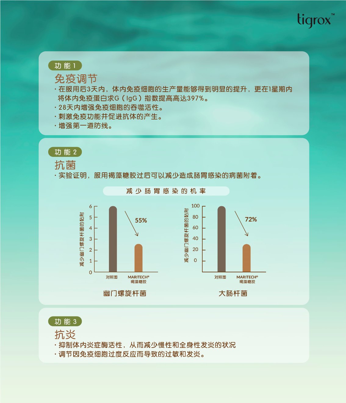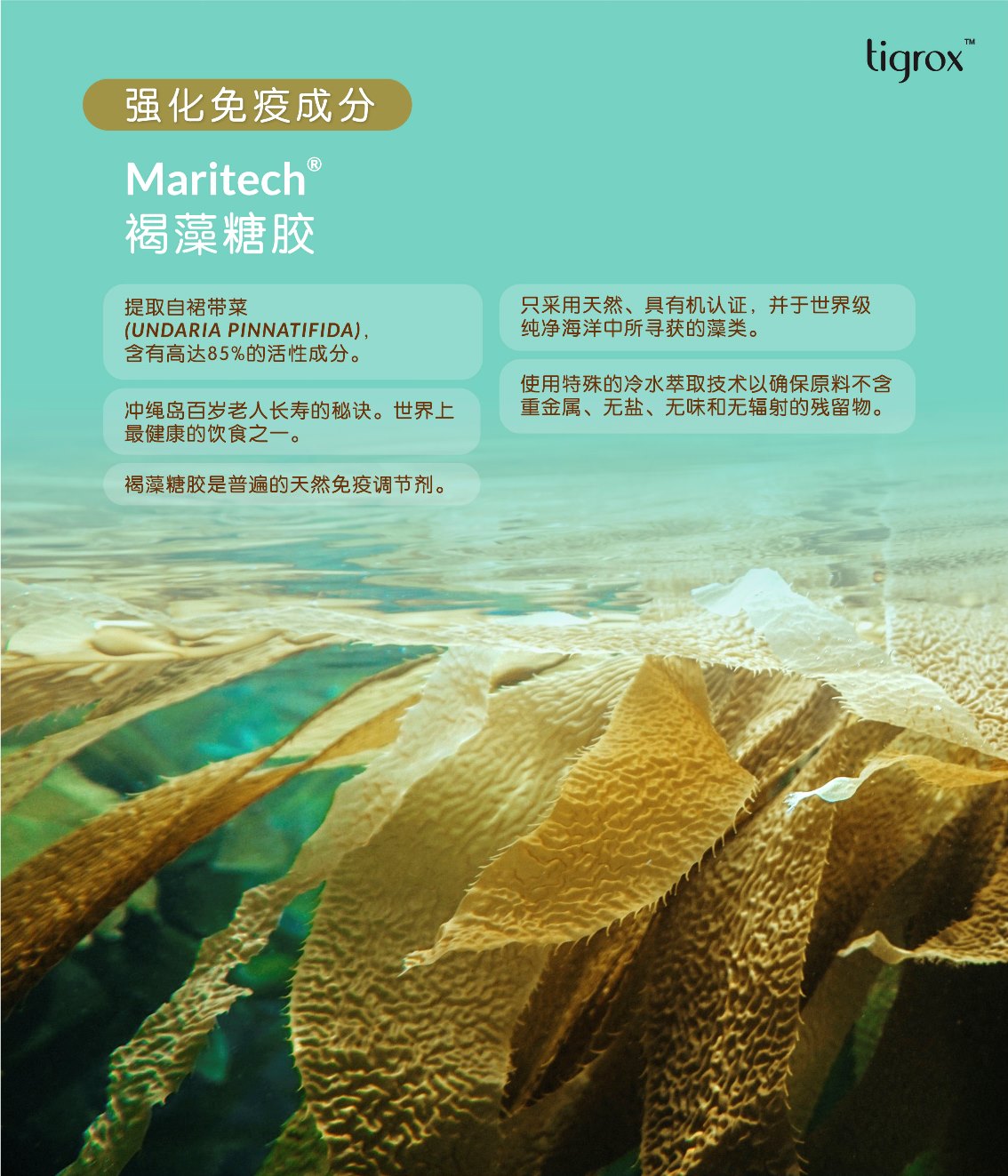 褐藻糖胶提取自裙带菜海藻, 含有高达85% 的褐藻胶活性成分。 它主要可以帮助免疫调节, 能明显提升体内免疫细胞的生产量。 褐藻糖胶也可以抗菌和抗炎, 服用后可以减少病菌附着和减少慢性和全身性发炎的状况。
