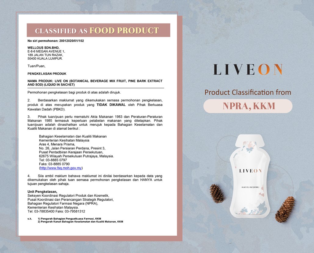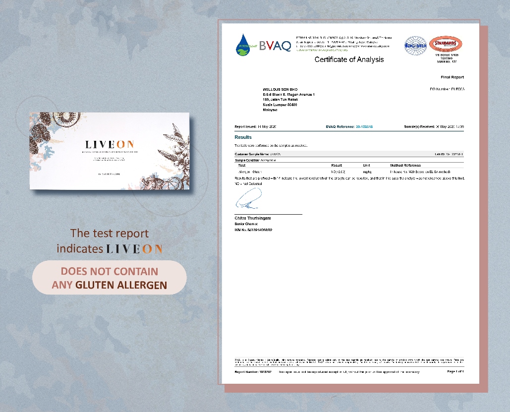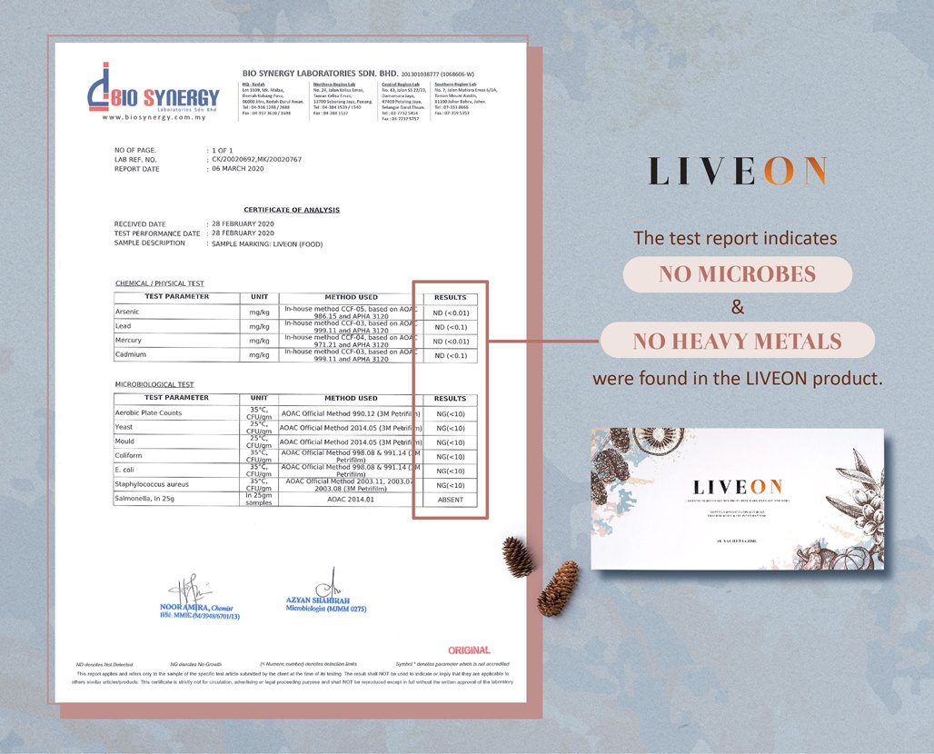 In order to ensure that our LIVEON can be sold safely, LIVEON has undergone strict quality inspection in the laboratory, and KKM and NPRA are classified as food product. The above are the lab reports, LIVEON is free of Microbes and heavy metals, and also does not contain any gluten allergens.